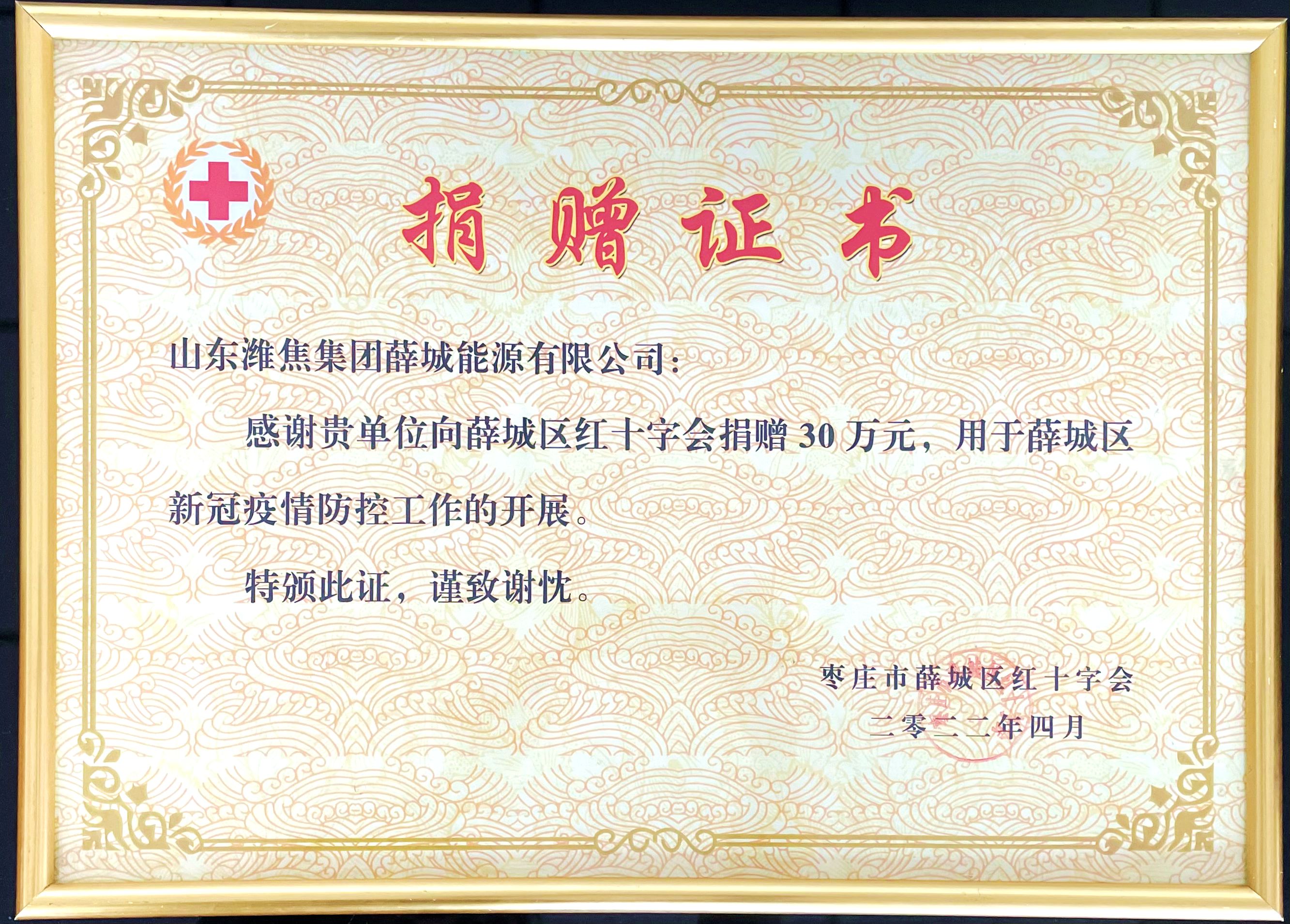 4月11日,薛城能源公司收到棗莊市薛城區(qū)紅十字會(huì)頒發(fā)的捐贈(zèng)證書(shū)及區(qū)委統(tǒng)籌疫情防控和經(jīng)濟(jì)運(yùn)行工作領(lǐng)導(dǎo)小組發(fā)來(lái)的感謝信,感謝企業(yè)為地區(qū)疫情防控慷慨捐贈(zèng)30萬(wàn)元!